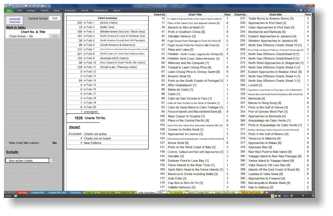 Axcel ChartManagement finds its application on board ships. In this Excel program, route data can be stored, easily seached, filtered and retrieved. It also offers a convenient management of seacharts carried on board. The program combines both elements and offers the possibility to fill in a voyage planning form embedded in the Excel file. Especially with almost daily routes and dense port rotation a lot of time can be saved as some information (such as total distance, river times and river distances, radio frequencies, nautical publications etc.) can be reused on repeatedly travelled voyage legs. Intuitive use The chart management consists of two worksheets: “Charts all” and “Charts by Folios”. Both worksheets are interlinked and any change made on one worksheet will be reflected on the other. A total of 20 chart folios are available to the user to arrange and group the chart stock (e.g.: one folio for a certain trading area or representing the content of a drawer in the chart table on the bridge). Each chart can be assigned a “date on board” and a “date off”. All seacharts required for a particular voyage leg (stored with route information in the route database) will automatically be crossed-checked with the inventory list as soon as a particular route is loeded and the status of each chart is immediatly displayed by the use of a simple colour code. .