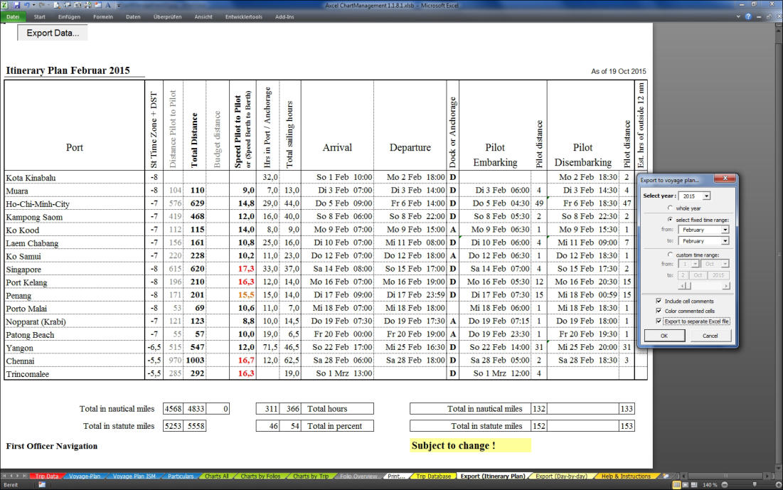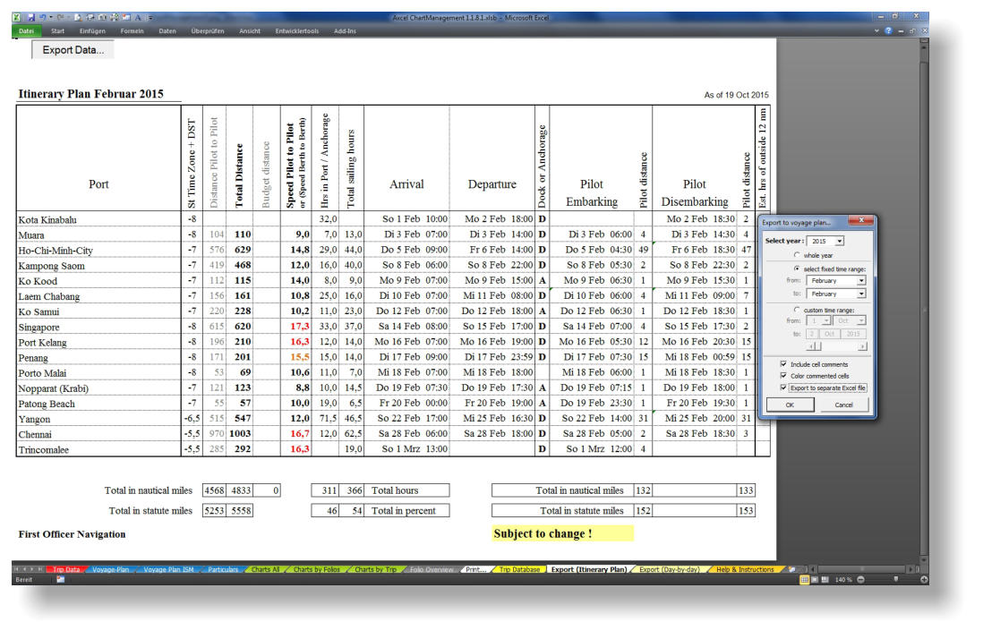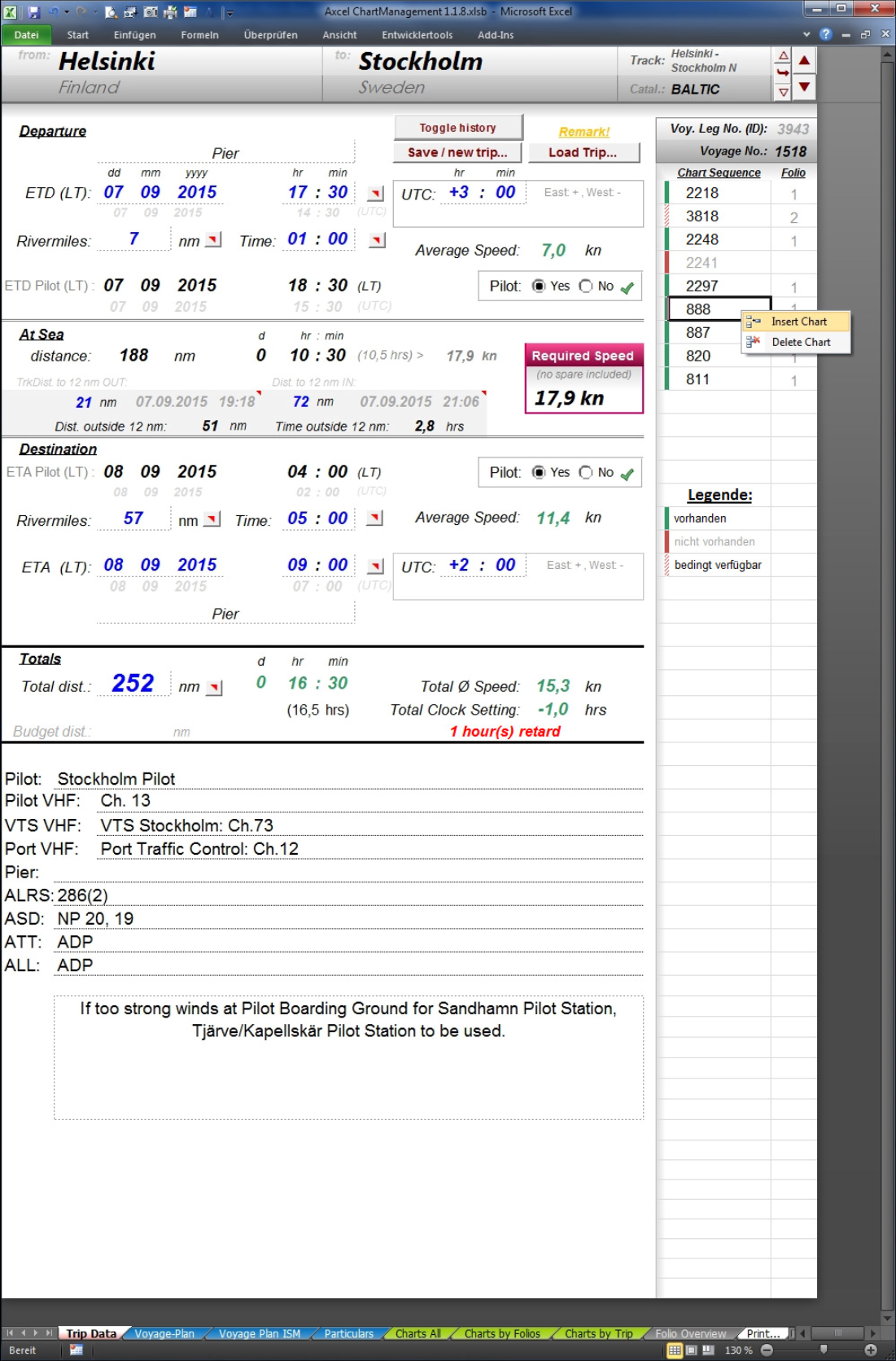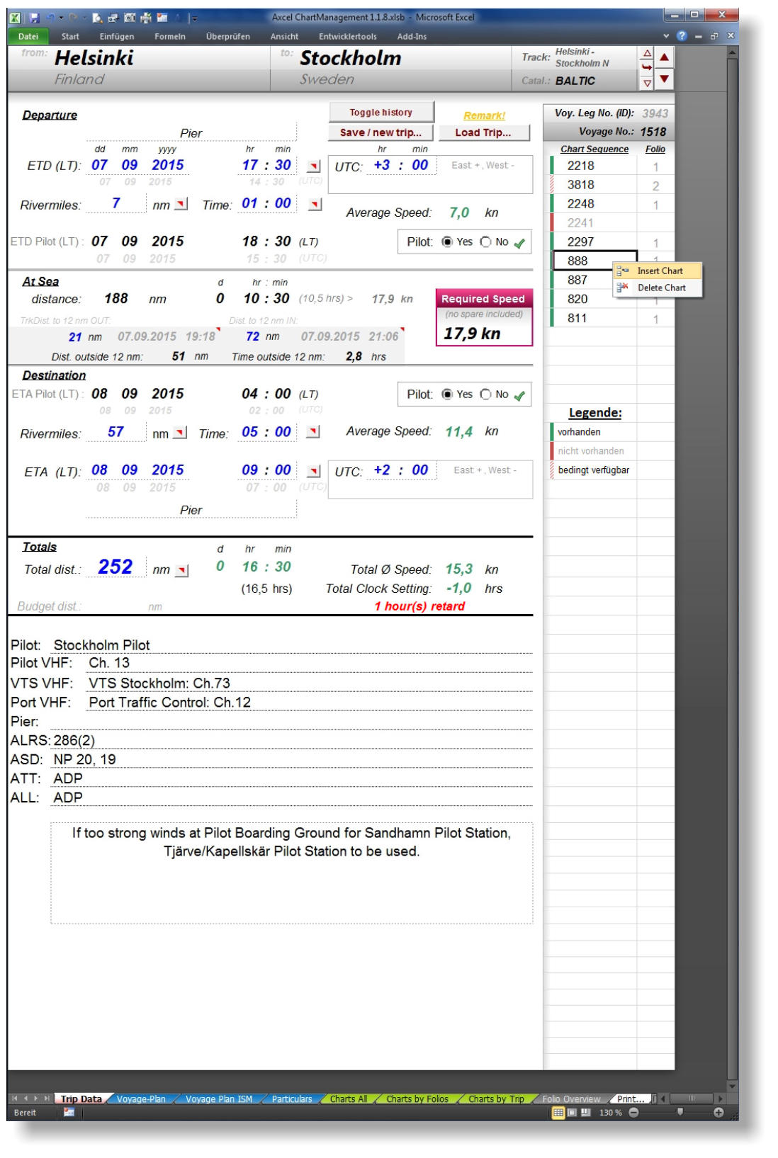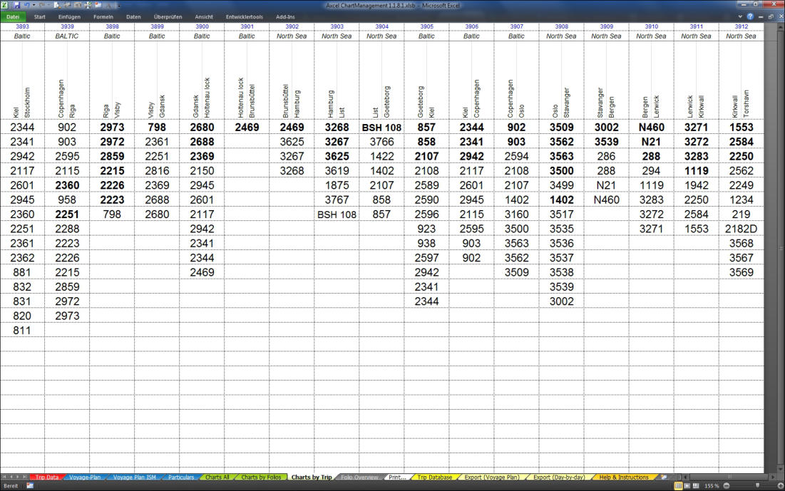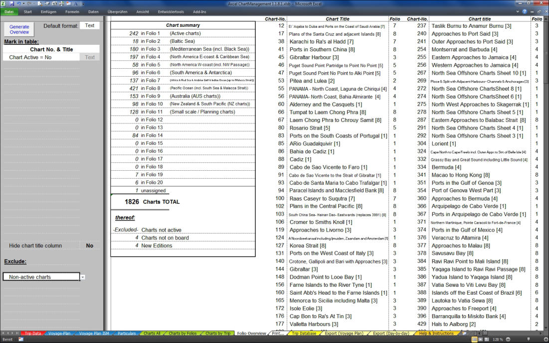 Axcel ChartManagement findet seine Anwendung an Bord von Seeschiffen. In diesem Excel-Programm können Routendaten abgespeichert und leicht wiedergefunden werden. Ebenfalls bietet es eine komfortable Verwaltung der an bord befindlichen Seekarten. Das Programm verknüpft beide Elemente und bietet die Möglichkeit, diese Informationen in ein in Excel eingebettetes Voyage Planning Form (Formblatt zur Routenplanung) per Knopfdruck einzufüllen. Insbesondere bei fast täglichen Routen und dichter Hafenfolge kann so viel Zeit erspart werden. Insbesondere dann, wenn Routen wiederholt gefahren werden und einige Informationen (wie Gesamtdistanz, Revierzeiten und Revierdistanzen, Funkfrequenzen, Nautische Publikationen etc.) wiederverwendet werden können. Intuitive Bedienbarkeit Die Kartenverwaltung besteht aus zwei Tabellenblättern: “Charts all” und “Charts by Folios”. Beide Tabellenblätter arbeiten zusammen, d.h. in einem Tabellenblatt vorgenommene Änderungen werden in das jeweils andere Tabellenblatt übernommen. Insgesamt stehen 20 sog. “Folios” (=Gruppen) zur Verfügung. Jede Karte kann flexibel in einen dieser Folios eingeordnet werden, die thematisch eine logische Gruppe darstellen können (z.B. eine Gruppe für ein bestimmtes Fahrtgebiet oder eine Gruppe entspricht der Schublade des Kartentisches auf der Brücke). Alle Karten können mit einem Datum des an Bord kommens und des von Vord gehens versehen werden. Die in der Routendatenbank für eine Route hinterlegten Seekarten werden bei Laden der Route per Formel mit dem Kartenbestand in der Inventurliste verglichen und der Status sogleich farblich markiert. .