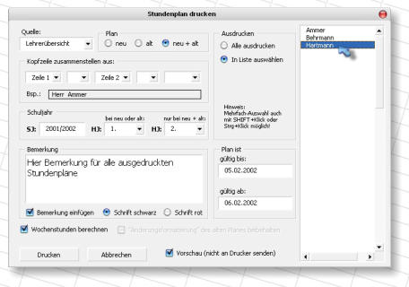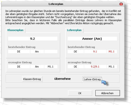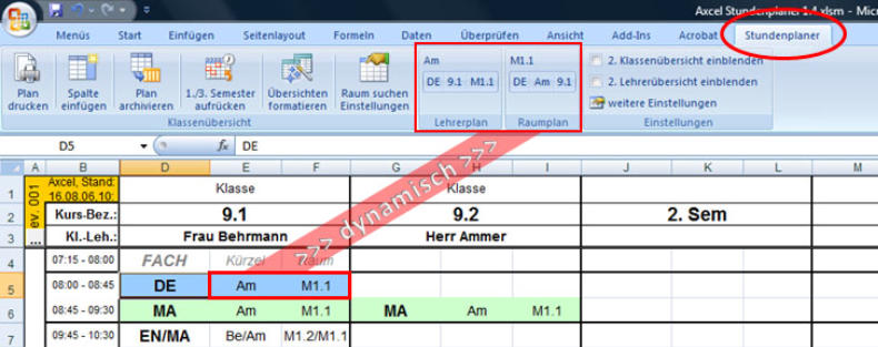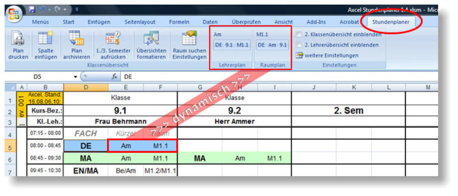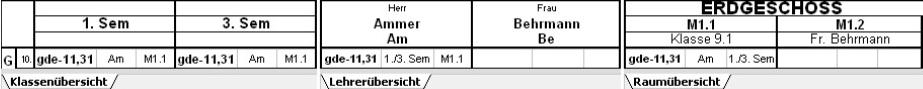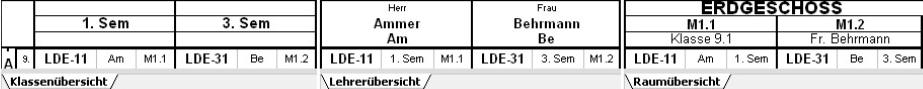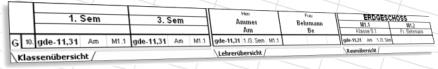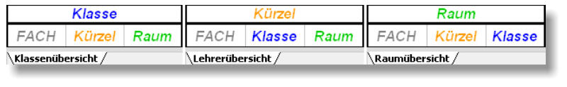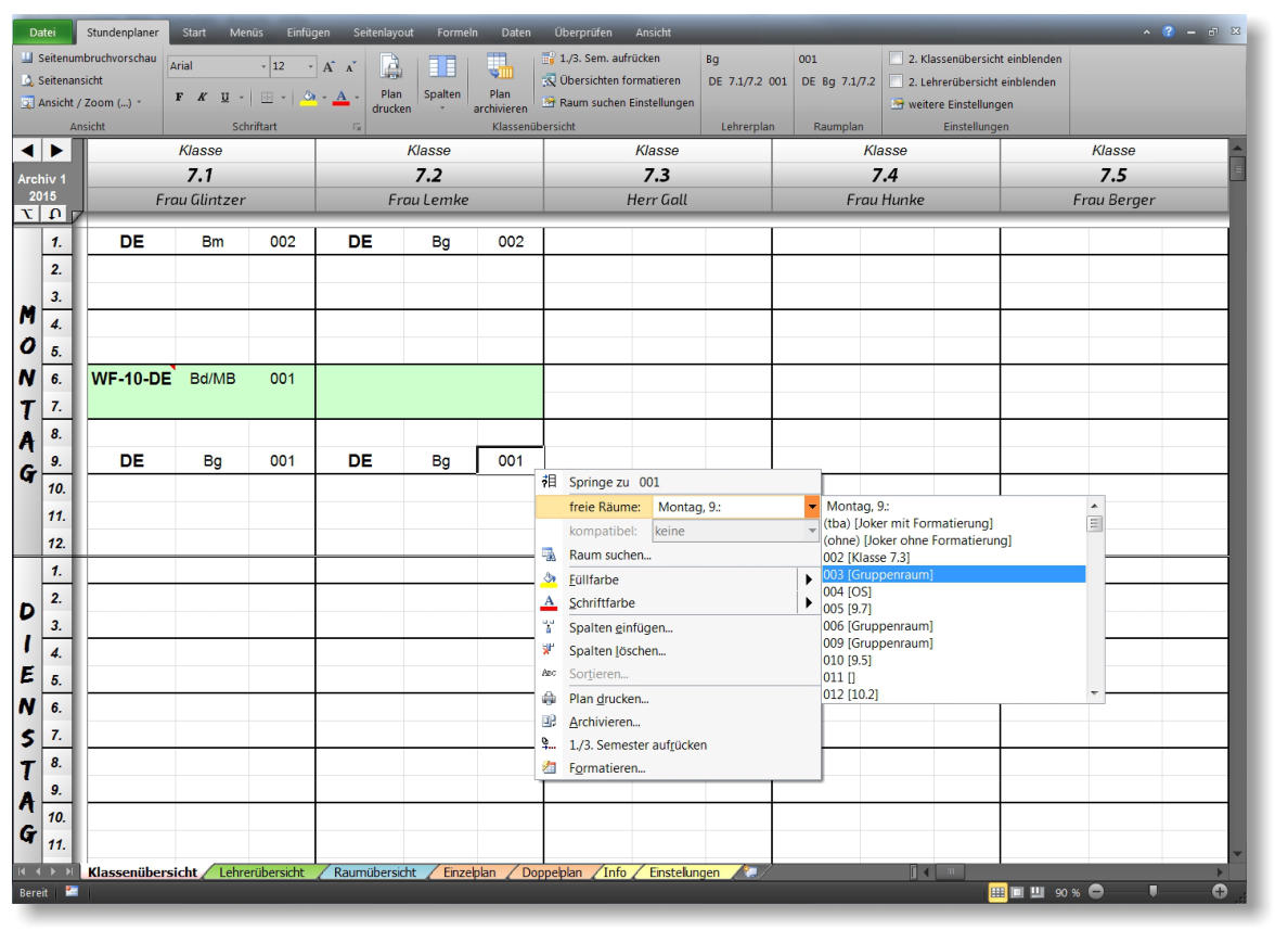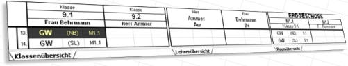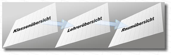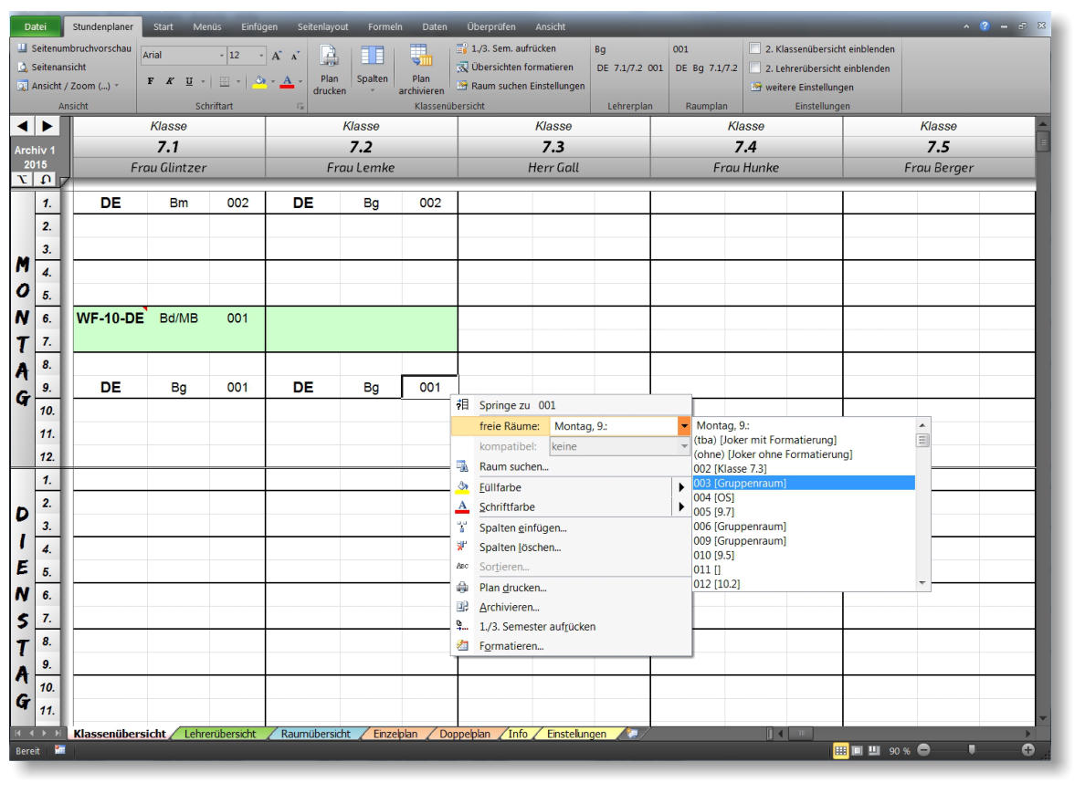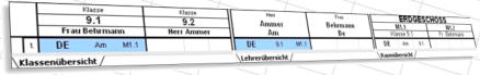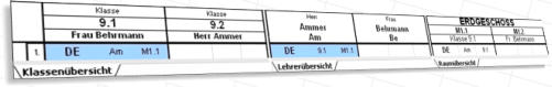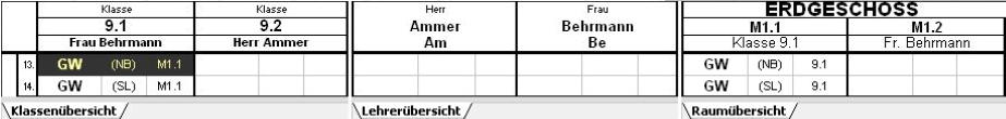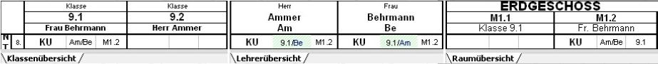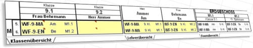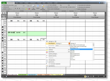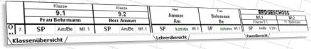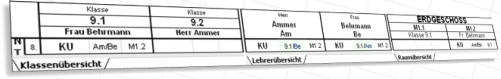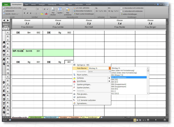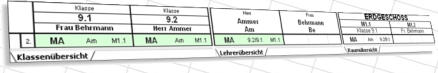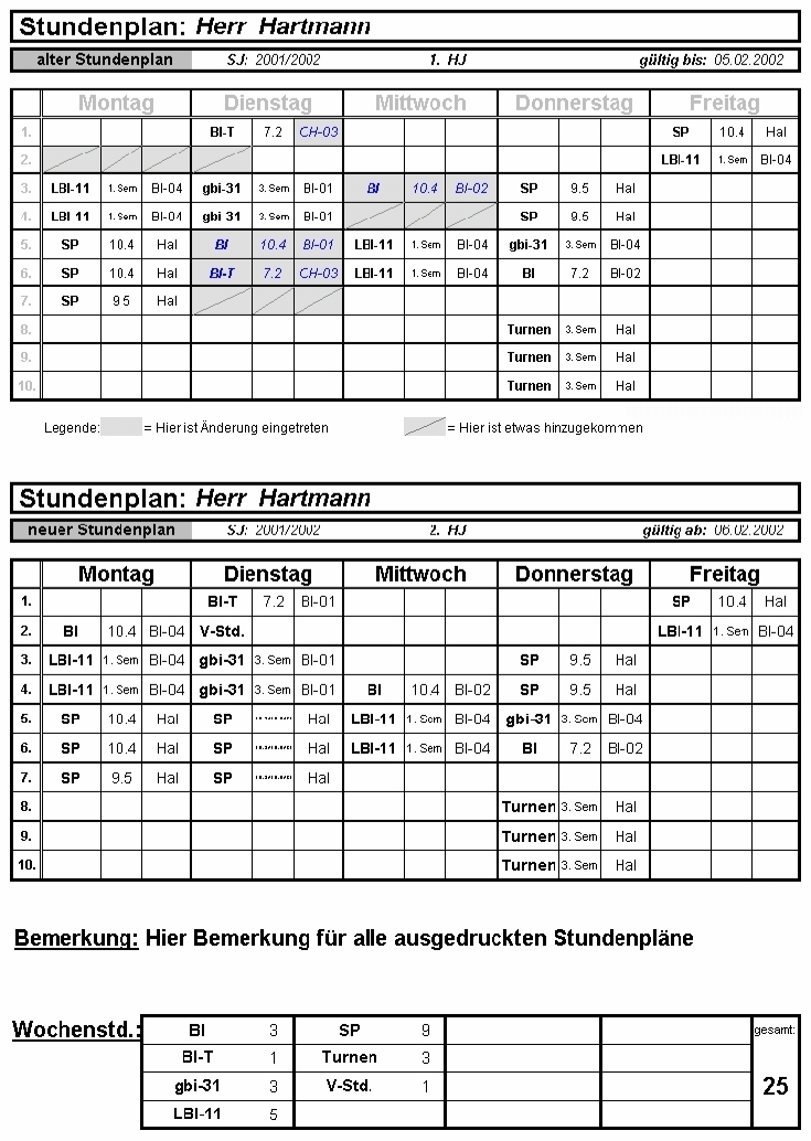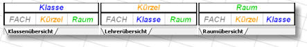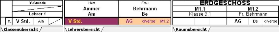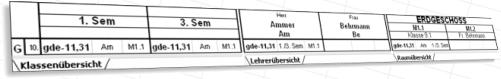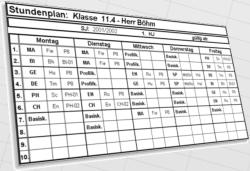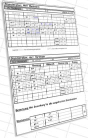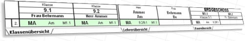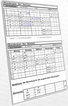 Das Tabellenblatt Klassenübersicht ändert das Tabellenblatt Lehrerübersicht und dieses wiederum die Raumübersicht. Geben Sie also etwas direkt in der Lehrerübersicht ein, so hat dies nur Auswirkungen auf die Raumübersicht. Das hat den Vorteil, dass man im Lehrerplan Aktivitäten eintragen kann, die nicht unbedingt mit einer Klasse oder einem Semester zutun haben, wohl aber einen Raum beanspruchen (z.B. Seminar, Arbeitsgemeinschaft etc.). Weiterhin kann in der Raumübersicht zum Beispiel eine Aktivität vermerkt werden, die weder mit einer spezifischen Klasse noch mit einer Lehrkraft zutun hat (z.B. Tanzkurs einer Gruppe von außerhalb). Eine Ausnahme bilden die Lehrerkürzel-Joker (benutzerdefiniert), mit denen Sie Einträge aus der Klassenübersicht unter Umgehung der Lehrerübersicht in die Raumübersicht übertragen. Übersichtlichkeit und intuitive Bedienbarkeit Das Kontextmenü innerhalb der Stundenplantabelle enthält alle wichtigen Funktionen, unter anderem der Sprung zum jeweiligen Lehrer oder Raum und eine Liste aller freien Räume und Lehrer in der betreffenden Stunde. Bei Doppelstunden kann über eine Dialogbox ein Raum gesucht werden, der für beide Stunden frei ist. Die Wiedererkennung von Einträgen sorgt dafür, dass bei erneuter Eingabe eines Fachs die ursprünglich zugewiesene Lehrkraft und der Raum sofort eingetragen werden, sofern beide verfügbar. Für bestimmte Fachabkürzungen (seit Version 1.2 benutzerdefiniert) sucht das Programm nach der Eingabe von Fach und Kürzel automatisch einen Klassenraum und belegt diesen, sofern er frei ist. Die Klassenraumzuteilung erfolgt in der Raumübersicht in der 3. Kopfzeile. Analog kann auch einer Lehrkraft ein eigener Raum zugewiesen werden. Wird ein Lehrer (versehentlich?) in einer anderen Klasse zeitgleich eingesetzt, erscheint eine Dialogbox und macht Lösungsvorschläge. Mit der Archiverungsfunktion werden die Änderungen des Stundenplans in einer Kopie farblich markiert. Wahlweise kann die gesamte Übersicht oder nur einzelne Klassen (bzw. Lehrer) unter die Stundenplantabelle kopiert (archiviert) werden. Die so markierte Kopie kann später auch ausgedruckt werden und sorgt zum Beispiel bei halbjährlichen Stundenplanänderungen für Übersichtlichkeit und Durchblick. Seit Stundenplaner Version 1.4 gibt es für jüngere Excel Versionen (ab Office 2007) nun ein eigenes Register "Stundenplaner" auf dem auch die zugehörigen Datensätze der aktuell ausgewählen Zelle sofort nachgeschlagen und angezeigt werden. Mit einem Klick auf die angezeigten Daten springt man direkt zum Datensatz auf das entsprechende Tabellenblatt. Individuelle Einzelstundenpläne drucken Für Klassen, Lehrer und Räume können ansehnliche Einzelpläne ausgedruckt werden. Das umfangreich ausgestattete Druckmenü erlaubt es Ihnen dabei unter anderem Bemerkungen zu allen Plänen auszudrucken, Wochenstunden für Lehrer in einer separaten Tabelle berechnen zu lassen und einen archivierten Plan ohne Änderungsformatierung auszudrucken. Die Daten werden für den Ausdruck aus der jeweiligen Übersicht in die Ausdruckvorlagen "Einzelplan" bzw. "Doppelplan" übertragen. Die Vorlagen sind für den Benutzer frei formatierbar, was Farben, Rahmen, Schrift etc. angeht.           Die Übersichten (Tabellenblätter) können für den Planer ausgedruckt werden, wobei die farbigen Markierungen für Übersichtlichkeit sorgen. Beispieldatensätze und Sonderfunktionen Die vor Eingabe gemachten Farbmarkierungen im Klassenplan werden in den Lehrerplan übernommen. So markierte Stunden lassen sich im Lehrerplan dann leicht wiederfinden. Alternativ kann die farbliche Markierung auch in die Raumübersicht übernommen werden. Bei klassenübergreifenden Veranstaltungen werden im Lehrer- und Raumplan alle betreffenden Klassen aufgelistet. Teilungsstunden (bisher nur 2-fach Teilung möglich) können in der gleichen Zelle dargestellt werden. Dazu wird "/" als Trennung der beiden Datensätze verwendet. Optional kann im Lehrer- und Raumplan eine Kennung an das Fach gehangen werden, um die Teilung in diesen Plänen ersichtlich zu machen. Die Wiedererkennung von Datensätzen funktioniert auch bei Teilungsstunden. Die Reihenfolge der Datensätze innerhalb der Zellen spielt keine Rolle. Blockstunden, bei denen der Klassenverbund aufgelöst ist (z.B. Wahlpflichtfächer) und bei denen es sich meist um Doppelstunden handelt können platzsparend im Klassenplan über einen Zellkommentar vermerkt werden. Dabei wird eine zweite Stunde als Kommentar vermerkt und muss nicht explizit eingegeben werden. Damit wird mehr Platz zur Unterbringung aller parallel laufenden Kurse geschaffen. Beim Ausdruck des Klassenstundenplans wird in der betreffenden Stunde lediglich eine allgemeine Fachbezeichnung verwendet. Analog dazu wird im Lehrer- und Raumplan eine allgemeine Klassenbezeichnung verwendet. Diese Sonderfunktion wird an der Fachbezeichnung (benutzerdefiniert) erkannt. Teilungen und andere Sonderfunktionen stehen bei Blockfächern nicht zur Verfügung                     Bei co-edukativem Unterricht (z.B. Hospitant-Stunde von Lehrer und Referendar) erscheint zusätzlich das Kürzel der jeweils anderen Lehrkraft im Lehrerplan. Die kreuzweise Unterbringung des mit-unterrichtenden Lehrers funktioniert auch bei klassenübergreifendem Unterricht, wie z.B. dem nach Geschlechtern getrennten Sportunterricht zweier Klassen. Der Unterricht der Oberstufe wird Stunde für Stunde explizit eingegeben, da hier kein Klassenverbund mehr besteht. Dabei empfiehlt es sich, Kurse spaltenweise nach verwandten Fächern einzugeben. Für die halbjährliche Änderung der Kurs- und Semesterbezeichnungen steht ein Menüpunkt "Semester aufrücken" zur Verfügung. Das 1. und 3. Semester wird damit zum 2. und 4. Semester gemacht. Bei semesterübergreifenden Kursen verwendet das Programm eine platzsparende Kurzversion des Semestereintrags im Lehrer- und Raumplan. Eine (optional auch mehrere) geson