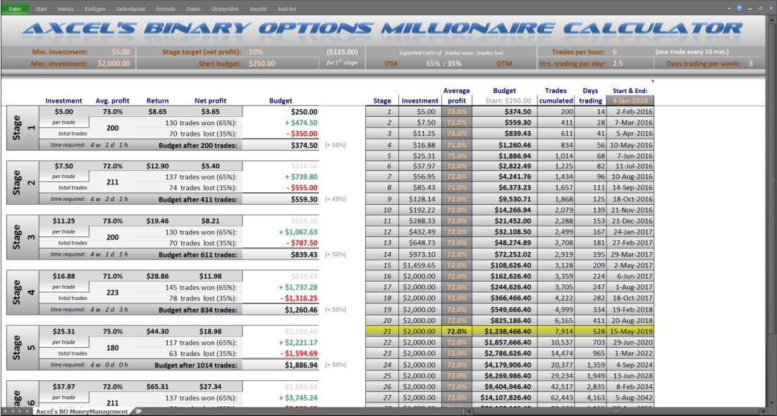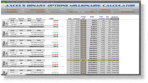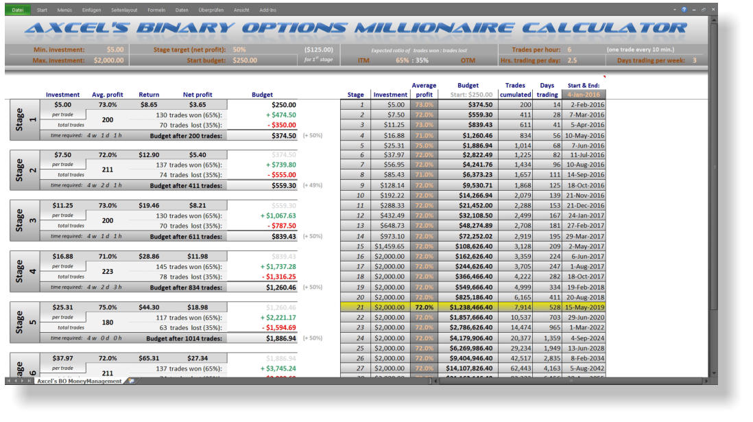 In many spam mails, the Martingale strategy is being touted as an alleged insider tip to earn a lot of money at online casinos. I had to create a Martingale Simulator in Excel to investigate for myself this so lucrative method and put to the test. The result of each iteration of the simulation is shown very clearly in a graph and is sobering, but better you try yourself ...Axcel Martingale Simulator simulates a desired number of Roulette games by the use of a random number generator and based on userdefined start values. As per Martingale strategy, the stake is doubled after each lost game. The user can set a acceptable maximum loss series for the simulation up to which the stake is doubled. In addition, several variations of the strategy can be tried out: a) after a certain loss series, retain the last stake instead of doubling or start again with the minimum stake.b) after a certain loss series, bet on the opposite (i.e. change from black to red or vice versa) and thereby speculate that the series will persist.c) If the stake exceeds the budget, risk the remaining budget or rather start again with the minimum stake.Binary Options Millionaire CalculatorAn equally lucrative source of money is supposed to be trading binary options. On the internet you will find a great deal of fee-based services and products, all promising huge profit margins. I have created an Excel file which, based on several user-defined factors (e.g. average profit per winning trade, expected success rate, etc.) helps you calculate:a) how many trades it will approximately take until the start budget has reached a certain target value (e.g.: has doubled)b) by combitation of several stages with dynamically increased stakes, calculate after how many trades approximately the one million mark is reachedc) how long the process will take under certain assumptions (i.e. trades per hour, trading hours per day and trading days per week).Playing around with the parameters will give an idea how easy / difficult it will be to become a millionaire by trading binary options. Just see for yourself…