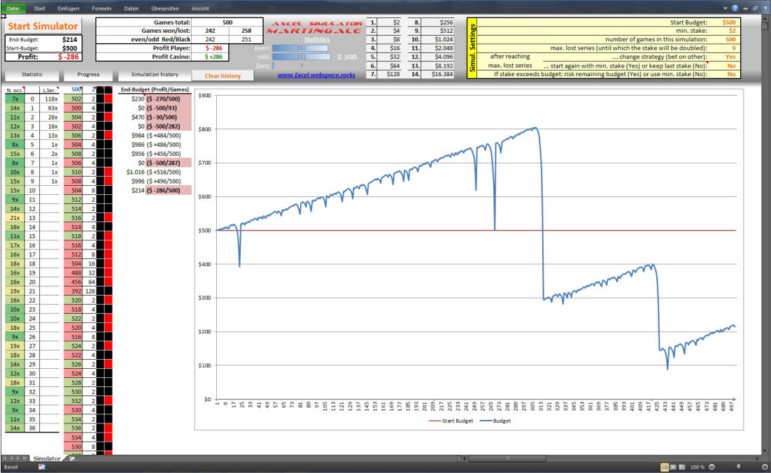 In many spam mails, the Martingale strategy is being touted as an alleged insider tip to earn a lot of money at online casinos. I had to create a Martingale Simulator in Excel to investigate for myself this so lucrative method and put to the test. The result of each iteration of the simulation is shown very clearly in a graph and is sobering, but better you try yourself ...Axcel Martingale Simulator simulates a desired number of Roulette games by the use of a random number generator and based on userdefined start values. As per Martingale strategy, the stake is doubled after each lost game. The user can set a acceptable maximum loss series for the simulation up to which the stake is doubled. In addition, several variations of the strategy can be tried out: a) after a certain loss series, retain the last stake instead of doubling or start again with the minimum stake.b) after a certain loss series, bet on the opposite (i.e. change from black to red or vice versa) and thereby speculate that the series will persist.c) If the stake exceeds the budget, risk the remaining budget or rather start again with the minimum stake.Binary Options Millionaire CalculatorAn equally lucrative source of money is supposed to be trading binary options. On the internet you will find a great deal of fee-based services and products, all promising huge profit margins. I have created an Excel file which, based on several user-defined factors (e.g. average profit per winning trade, expected profit rate, etc.) helps you calculate:a) how many trades it will approximately take until the start budget has reached a certain target value (e.g.: has doubled)b) by combitation of several stages with dynamically increased stakes, calculate after how many trades approximately the one million mark is reachedc) how long the process will take under certain assumptions (i.e. trades per hour, trading hours per day and trading days per week).Playing around with the parameters will give an idea how easy / difficult it will be to become a millionaire by trading binary options. Just see for yourself….