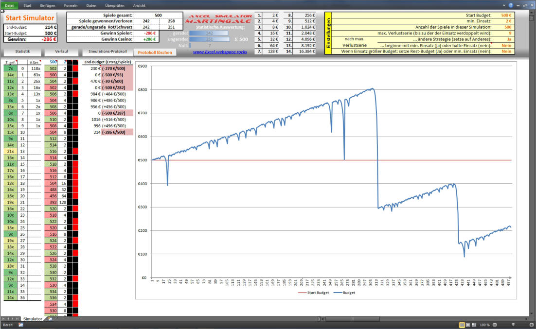 In vielen Spam-Mails wird wie Martingale-Methode in Online-Casinos als Geheimtipp angepriesen um damit richtig viel Geld zu verdienen. Ich habe dazu einen Martingale-Simulator in Excel gebaut um dieser Methode der Einkommensquelle etwas näher zu beleuchten. Das Ergebnis eines jeden Durchlaufs wird sehr anschaulich in einer Grafik angezeigt und ist ernüchternd…Nach Benutzervorgaben simuliert der Axcel Martingale Simulator durch einen Zufallsgenerator eine gewünschte Anzahl an Roulette-Spielen. Dabei wird der Einsatz nach jedem verlorenen Spiel gemäß der Martingale-Strategie verdoppelt. Der Benutzer kann für die Simulation eine maximale Verlustserie festlegen, bis zu der verdoppelt wird. Außerdem können einige Strategie-Variante ausprobiert werden: a) nach einer bestimmten Verlustserie den Einsatz beibehalten, statt ihn zu verdoppeln oder wieder mit dem kleinsten Einsatz beginnen.b) nach einer bestimmten Verlustserie auf etwas anderes setzen (z.B. von schwarz auf rot) und damit auf das Anhalten der aktuellen Serie spekulieren.c) Wenn der Einsatz das Budget überschreitet, ob man das restliche Budget riskieren oder wieder mit dem Mindesteinsatz beginnen möchte.Binäre Optionen Millionär RechnerEine ebenfalls lukrative Geldquelle soll der Handel mit Binären Optionen sein. Im Netz findet man dazu eine große Fülle von kostenpflichtigen Angeboten mit vielen Versprechungen. Ich habe eine Excel-Datei erstellt, in der man unter Vorgabe bestimmter Rahmenbedingungen (durchschnittlicher Profit pro gewonnenem Trade, erwartete Gewinnrate, Einsatz pro Trade etc.) errechnen lassen kanna) wieviel Trades man tätigen muß, bis das Start-Budget einen vorgegebenes Etappenziel erreicht hat (z.B. Verdopplung).b) nach wieviel Trades bzw. Etappen die Millionengrenze geknackt wird (durch Kombination verschiedener Etappen bei denen die Einsätze dynamisch gesteigert werden)c) wie lange das unter bestimmten Annahmen (Trades pro Stunde, Stunden pro Tag und Tage pro Woche) dauern wird.Durch Ausprobieren verschiedener Ausgangsparameter kann man sich somit selbst einen Eindruck manchen, wie leicht / schwer es werden wird durch Handel mit Binären Optionen zum Millionär zu werden. .