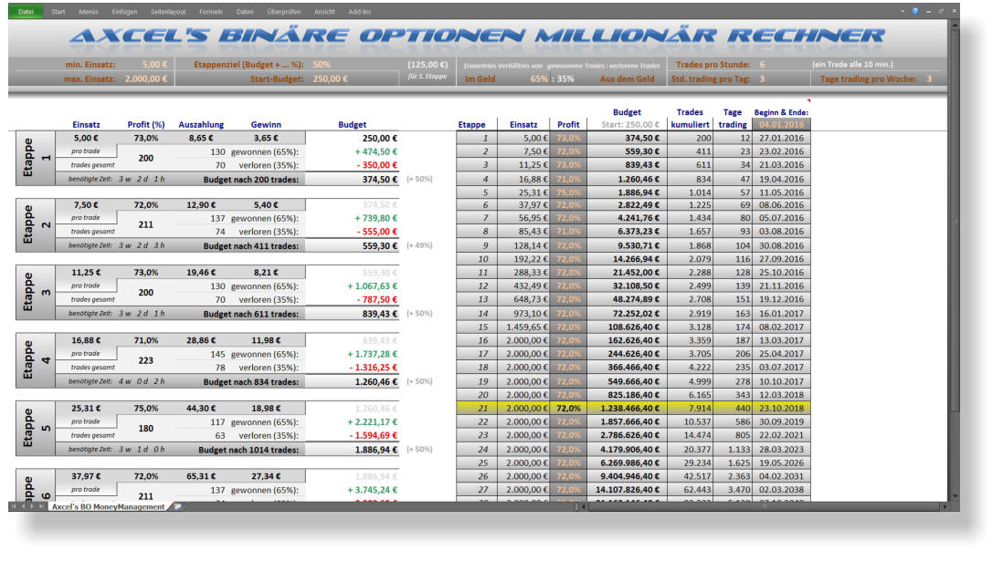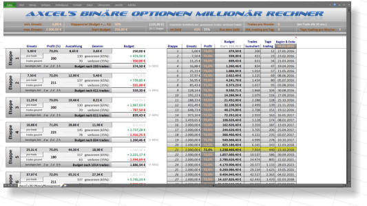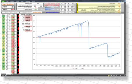 In vielen Spam-Mails wird die Martingale-Strategie als angeb-licher Geheimtipp angepriesen, um damit in Online-Casinos richtig viel Geld zu verdienen. Ich habe dazu einen Martingale-Simulator in Excel erstellt, um diese so lukrative Methode etwas näher zu beleuchten und auf die Probe zu stellen. Das Ergebnis eines jeden Durchlaufs wird sehr anschaulich in einer Grafik angezeigt und ist ernüchternd, aber probiert es selbst…Nach Benutzervorgaben simuliert der Axcel Martingale Simulator durch einen Zufallsgenerator eine gewünschte Anzahl an Roulette-Spielen. Dabei wird der Einsatz nach jedem verlorenen Spiel gemäß der Martingale-Strategie verdoppelt. Der Benutzer kann für die Simulation eine maximale Verlustserie festlegen, bis zu der verdoppelt wird. Außerdem können einige Strategie-Variante ausprobiert werden: a) nach einer bestimmten Verlustserie den Einsatz beibehalten, statt ihn zu verdoppeln oder wieder mit dem kleinsten Einsatz beginnen.b) nach einer bestimmten Verlustserie auf etwas anderes setzen (z.B. von schwarz auf rot) und damit auf das Anhalten der aktuellen Serie spekulieren.c) Wenn der Einsatz das Budget überschreitet, ob man das restliche Budget riskieren oder wieder mit dem Mindesteinsatz beginnen möchte.Binäre Optionen Millionär RechnerEine ebenfalls lukrative Geldquelle soll der Handel mit Binären Optionen sein. Im Netz findet man dazu eine große Fülle von kostenpflichtigen Angeboten mit vielen Versprechungen. Ich habe eine Excel-Datei erstellt, in der man unter Vorgabe bestimmter Rahmenbedingungen (durchschnittlicher Profit pro gewonnenem Trade, erwartete Gewinnrate, Einsatz pro Trade etc.) errechnen lassen kanna) wieviel Trades man tätigen muß, bis das Start-Budget einen vorgegebenes Etappenziel erreicht hat (z.B. Verdopplung).b) nach wieviel Trades bzw. Etappen die Millionengrenze geknackt wird (durch Kombination verschiedener Etappen bei denen die Einsätze dynamisch gesteigert werden)c) wie lange das unter bestimmten Annahmen (Trades pro Stunde, Stunden pro Tag und Tage pro Woche) dauern wird.Durch Ausprobieren verschiedener Ausgangsparameter kann man sich somit selbst einen Eindruck manchen, wie leicht / schwer es werden wird durch Handel mit Binären Optionen zum Millionär zu werden.